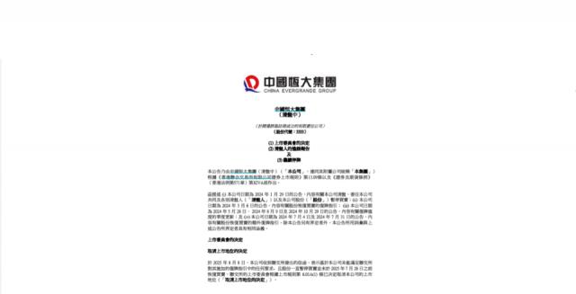 截至 2025 年 7 月 28 日,已连续停牌 18 个月。2024 年 1 月 29 日,香港高等法院对恒大颁布清盘令,委任清盘人接管资产,股票同步停牌。2025 年 8 月 12 日晚间,中国恒大集团(3333.HK)发布公告称,将在 8 月 25 日从港交所正式摘牌。