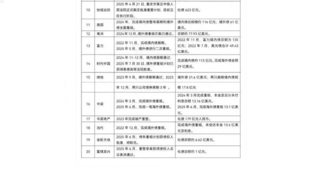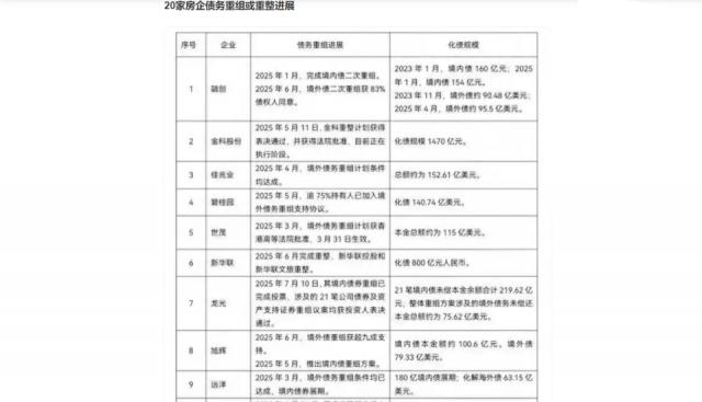 中梁、当代等企业完成境外债重组。旭辉、佳兆业、金轮天地、禹洲、世茂、绿地等企业的境外债务重组方案也已获批。2025 年 6 月,新华联完成重整,霍煤龙兴公司重整计划获批准。金科与协信远创的重整方案经批准后已进入执行阶段。
