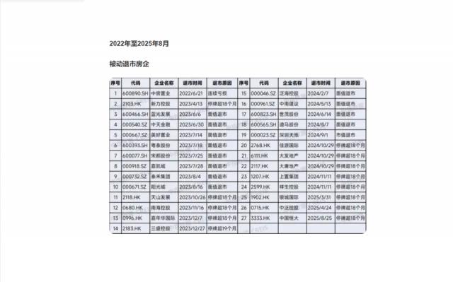 2022 年 -2025 年 8 月 A 股、港股上市房企被端退市记录原因来看,其中 A 股 14 家,原因为面值退市、连续亏损。 H 股 13 家,原因为财报难以发出及难以达成复牌指引,未能复牌,停牌超过 18 个月。另外, 有个别上市房企私有化退市。