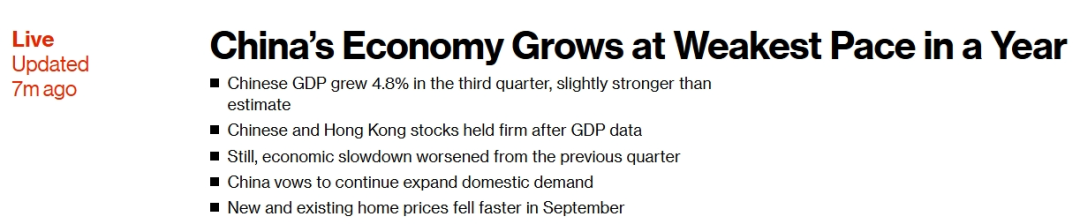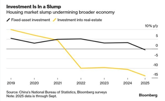 房价的影响是相关投资疲软,bloomberg计算了历年前三季度数据,今年房地产投资下跌13.9%是自2014年以来最低——